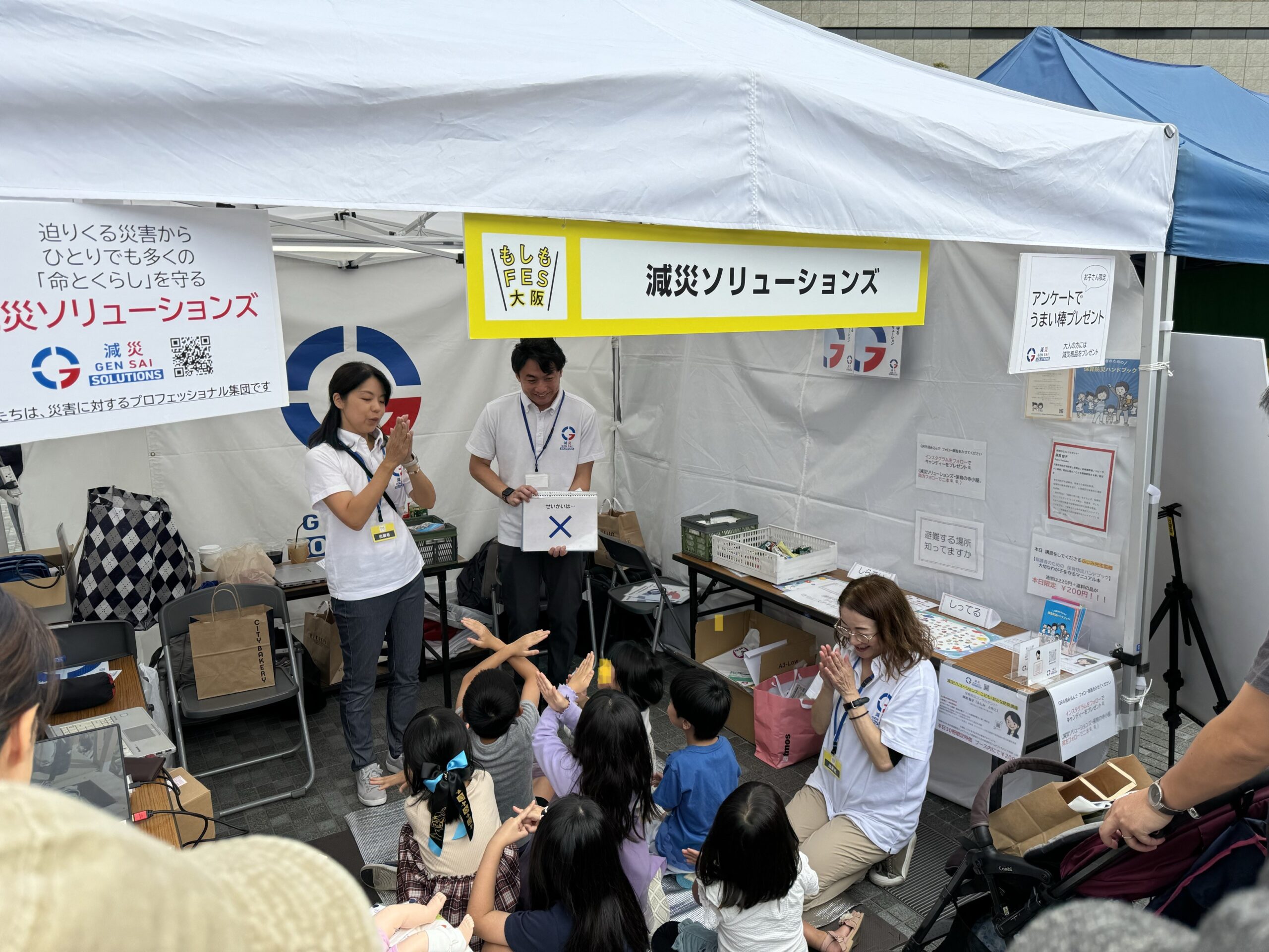 2024年10月26日・27日、グランフロント大阪で開催された「もしもフェス大阪2024」で、「こども・おとな防災講習」を実施しました。来場された子どもさんたちと一緒に、災害時に役立つ知識やスキルをクイズ形式で学びました。 ご参加いただいた皆様、ありがとうございました!